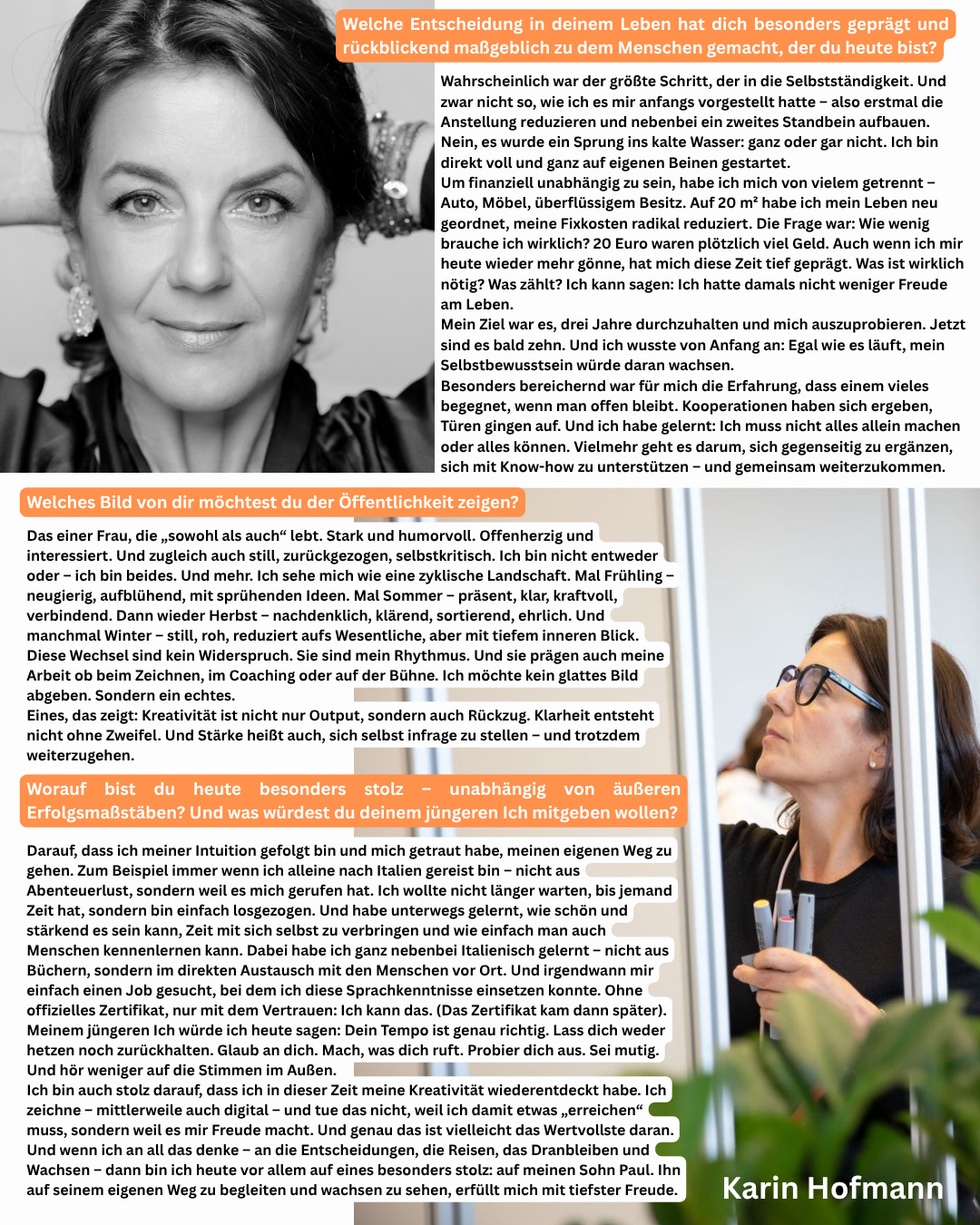 Karin sieht sich als zyklische Landschaft: Frühling, Sommer, Herbst, Winter – alles in ihr. Keine Rolle, kein Image. Sondern Echtheit. Wandel. Tiefe. Und die klare Haltung: Ich bin nicht entweder oder – ich bin beides. Und mehr.